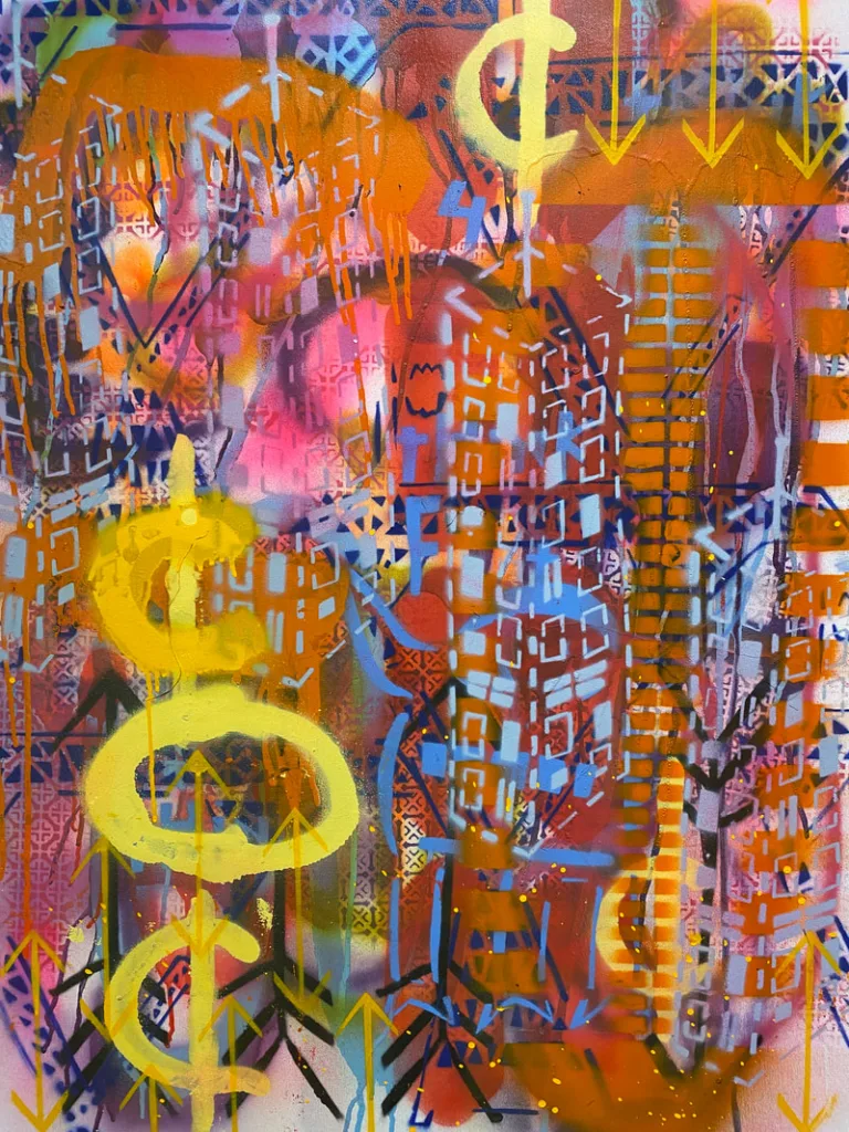 Urban Landscape explores the themes of home, permanence, and belonging. Each of these works were created in 2021, pulling from the artists’ experiences of 2020. Using her innate sense of composition, Wittenberg layers spray paint on canvas, both free form and using her vast collection of handcrafted stencils. The resulting works feel both fresh and deep, the vibrant colors pull the viewer in to explore these large scale works.