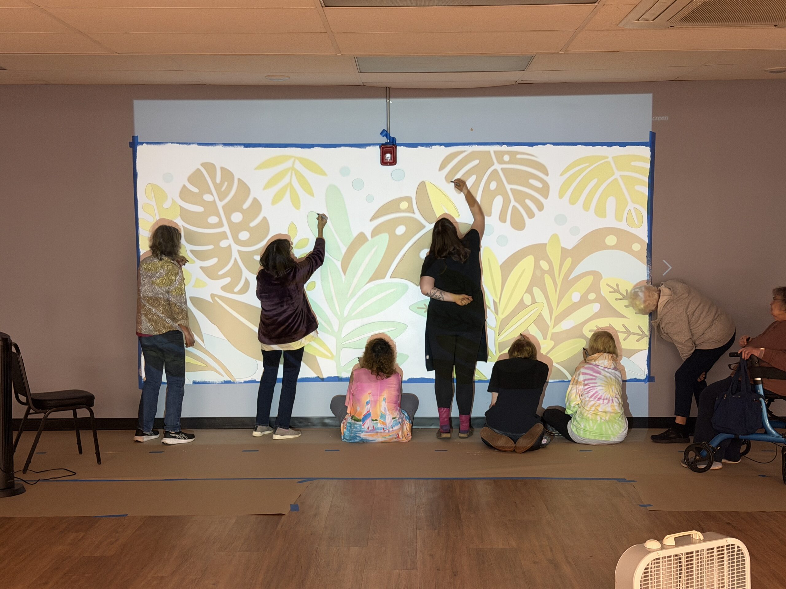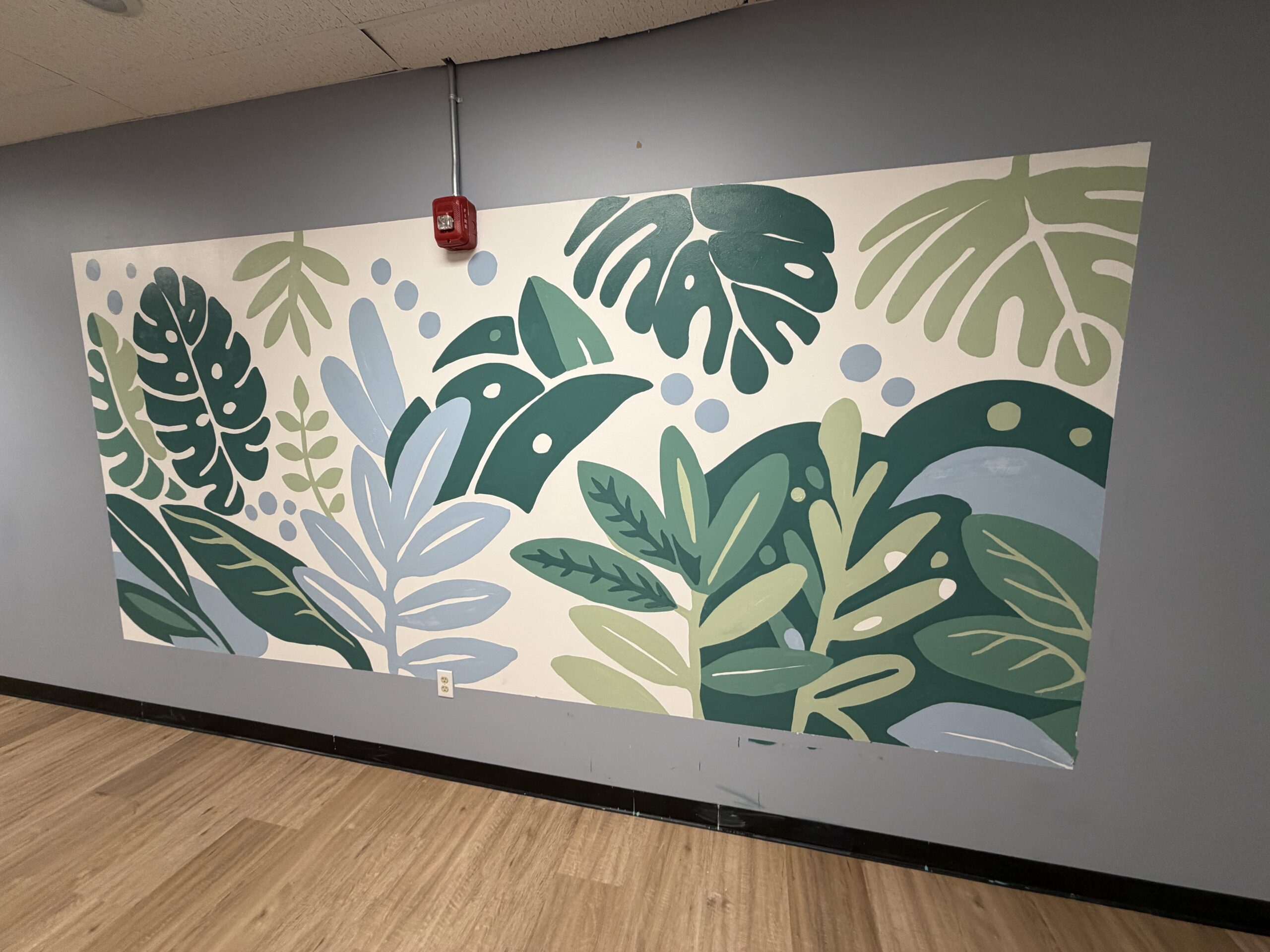 Sponsored by the Rochester Museum of Fine Arts (RMFA), the mural was painted inside the Senior Activity Center. The design features a lively, vector-style botanical pattern created as part of a collaboration between Senior Services Coordinator Michelle Breslin and Matt Wyatt of the RMFA.