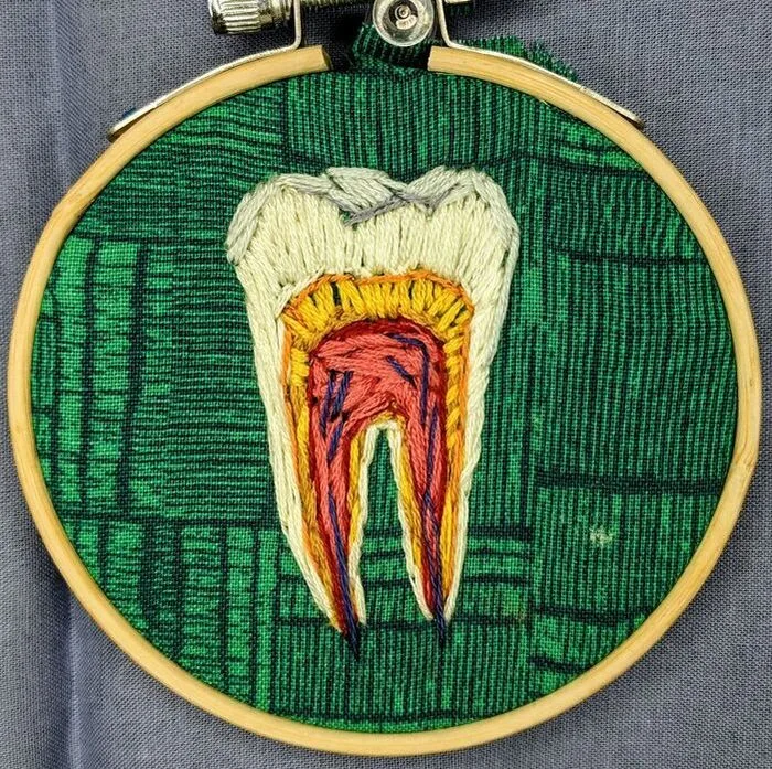 I stumbled upon embroidery. The thread-making marks similar to the way I once painted strokes. The subject matter though was just fun, not constricted or stuffy. It’s enjoyable to embroider subjects not traditionally thought to be decorative. To pair flowery fabrics with ham or lumberjack plaid with a uterus. The juxtaposition when pairing subject and fabric is a joy. And bonus, I get to create art while watching my children or on my lunch break at the hospital, relaxing in bed before falling asleep because thread is portable and the residual mess is nothing compared to oil paint.