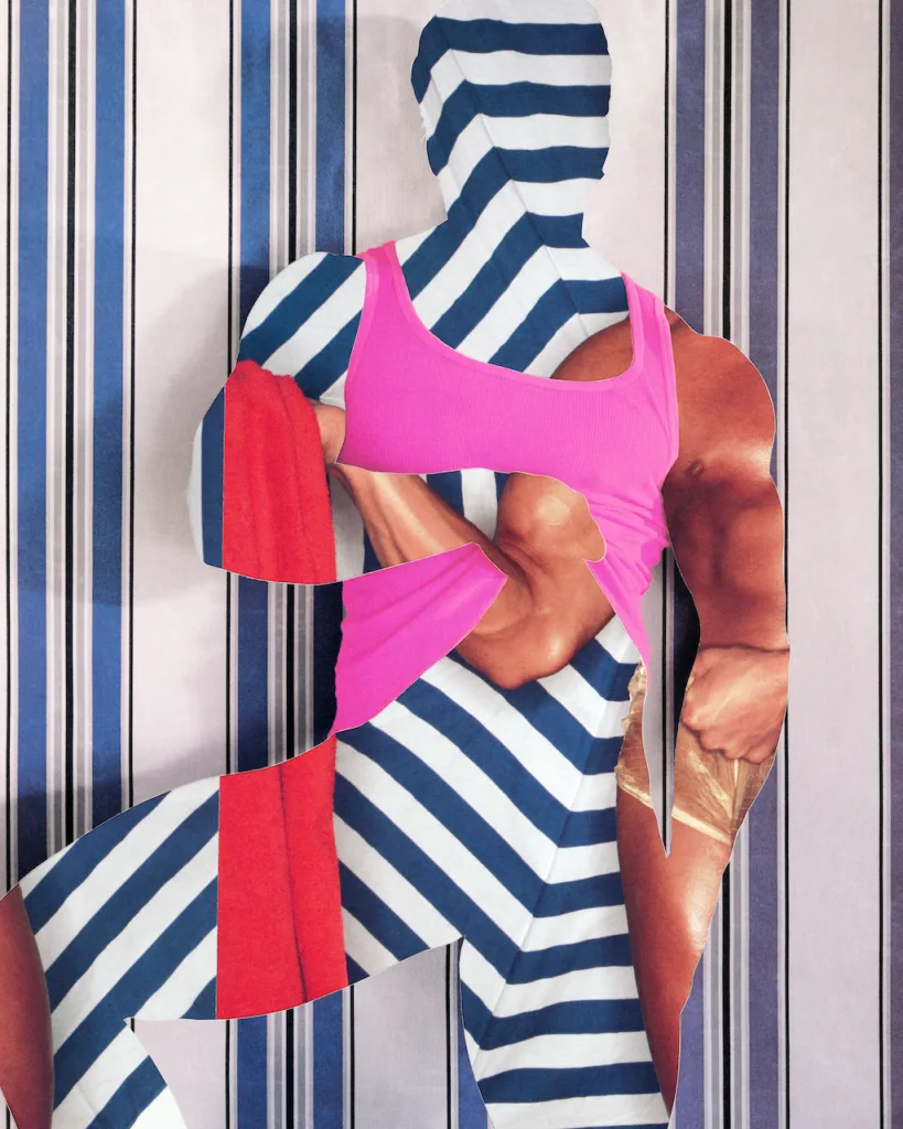 Each image is an amalgam of two figures that originally appeared in the same calendar. In the top layer the male body has been spliced from his scene and the figureless image is laid on top of a second image. Through the negative space of the absent figure, a censured portion of the figure beneath is revealed. The construction is then photographed, thus bringing both layers onto the same seamless photographic plane.