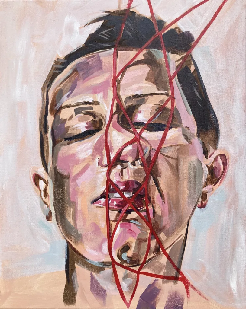 “In this body of work, I use string figures to access the larger threads that combine to create everyday life. By using symbols such as a water bottle, rocks, birds and hands interspersed and oriented around visible and invisible strings I begin to map a personal psychogeography. Jung used a stone as a symbol for the self while birds are classically the symbol for the soul. The metaphysical architecture that binds us together in the form of shared narrative and identity is depicted in fragments, letting the viewer intuit the line that connects each piece of the map. String figures are an ancient tradition used, as Donna Haraway points out, to facilitate a linguistic call and response – in this body of work the fragments, portraits, and strings themselves play off each other generating both formal and symbolic associations encouraging the viewer to think about what connects us, expressivity and the stories we tell about ourselves.”