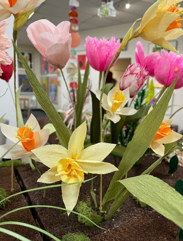 Since graduating, she has continued to learn the art of paper floristry. For Contrary, Hazen creates a New England-inspired garden, filling the exhibition with expertly crafted native flowers and plants including hollyhocks, hostas, buttercups, and poppies. As a nod to New England gardeners like her mother and sister, Hazen’s work makes permanent the fleeting spring season and lush flora. In We Are All Inside, Hazen created hanging strings of found paper, writing her thoughts, feelings, and concerns about the pandemic and racial injustice. She then folded the paper into origami houses and sewed them together to make long, varied strings. This work continues her exploration of home.